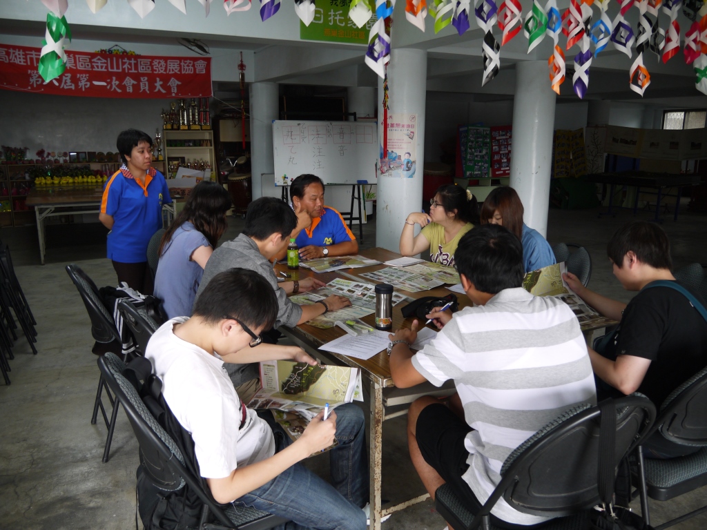 高雄市燕巢區金山社區是燕巢區最小也最偏遠的社區,社區人口雖然少,卻是高雄市農村再生的先行者。從民國99年開始,金山社區就積極的推廣社區著名的農產品芭樂與棗子,並結合農村再生計劃的資源,推動產業活化、導覽遊程以及文化體驗活動,逐漸打響金山社區的名號。不過也因為社區高齡長輩眾多,讓金山社區在社區活動推廣、網路行銷方面常常力不從心而覺得苦惱。今年夏天,社區利用行政院農委會水土保持局臺南分局推動農村再生的機會,結合中山大學公共事務管理研究所的同學們,引導青年學子主動且實地走入農村社區,與居民分享彼此生活經驗,並發揮在校所學,為保存在地文化與產業加值活化盡一份心力。