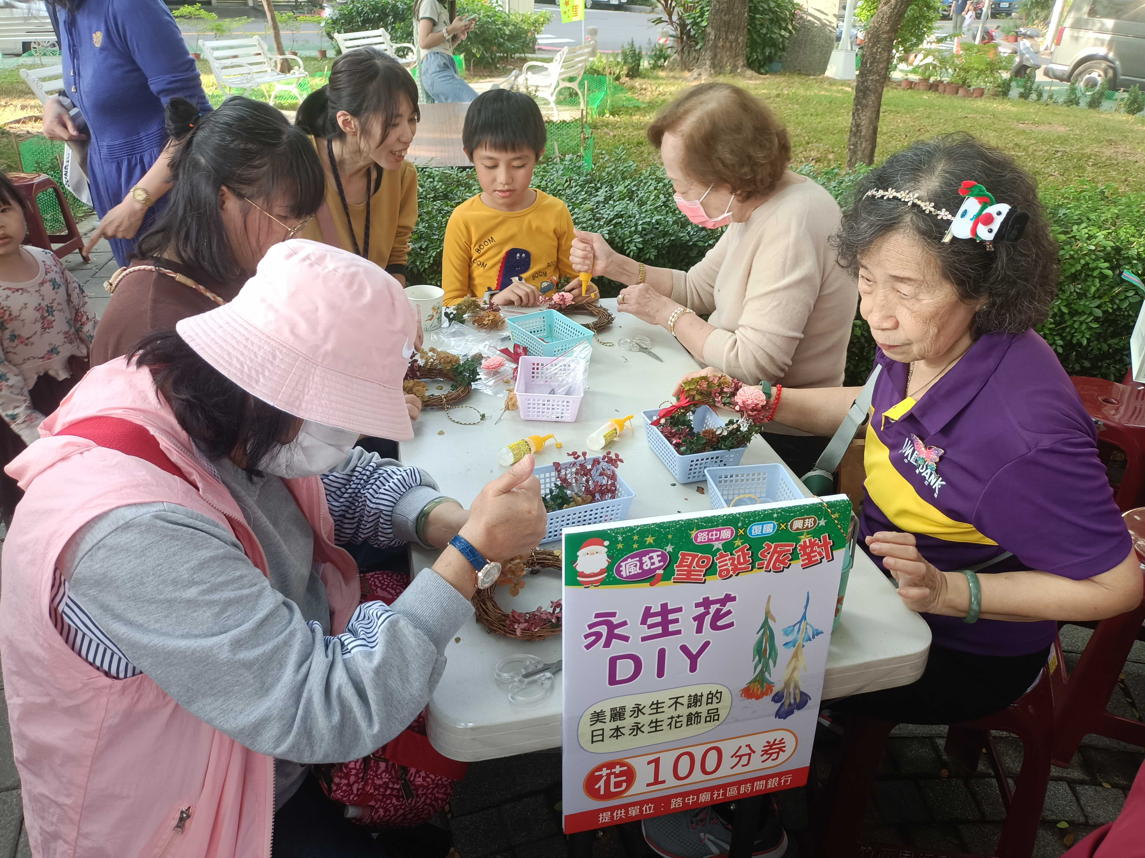 市集內容多元又富教育意義。復國社區帶來彩繪紙傘、拉密桌遊現場PK賽,並結合節氣推出冬至搓湯圓體驗與澎湖風味仙草;興邦社區則以園藝與社區教育為主題,設計禪繞畫種子創作、水苔球與多肉植栽體驗,還有寓教於樂的家暴防治猜猜樂,讓居民在互動中學習生活法律知識。帶著孩子前來的許小姐分享,這樣的市集比金錢交易更有人情味,孩子親自參與活動賺取時間貨幣,再兌換婆婆、阿姨們手作的作品,讓付出與收穫都變得格外珍貴。復國社區的藍先生也表示,跨社區合辦讓活動規模與內容更加豐富,看到年輕人與長輩一起互動、跳舞,感受到久違的跨世代活力。