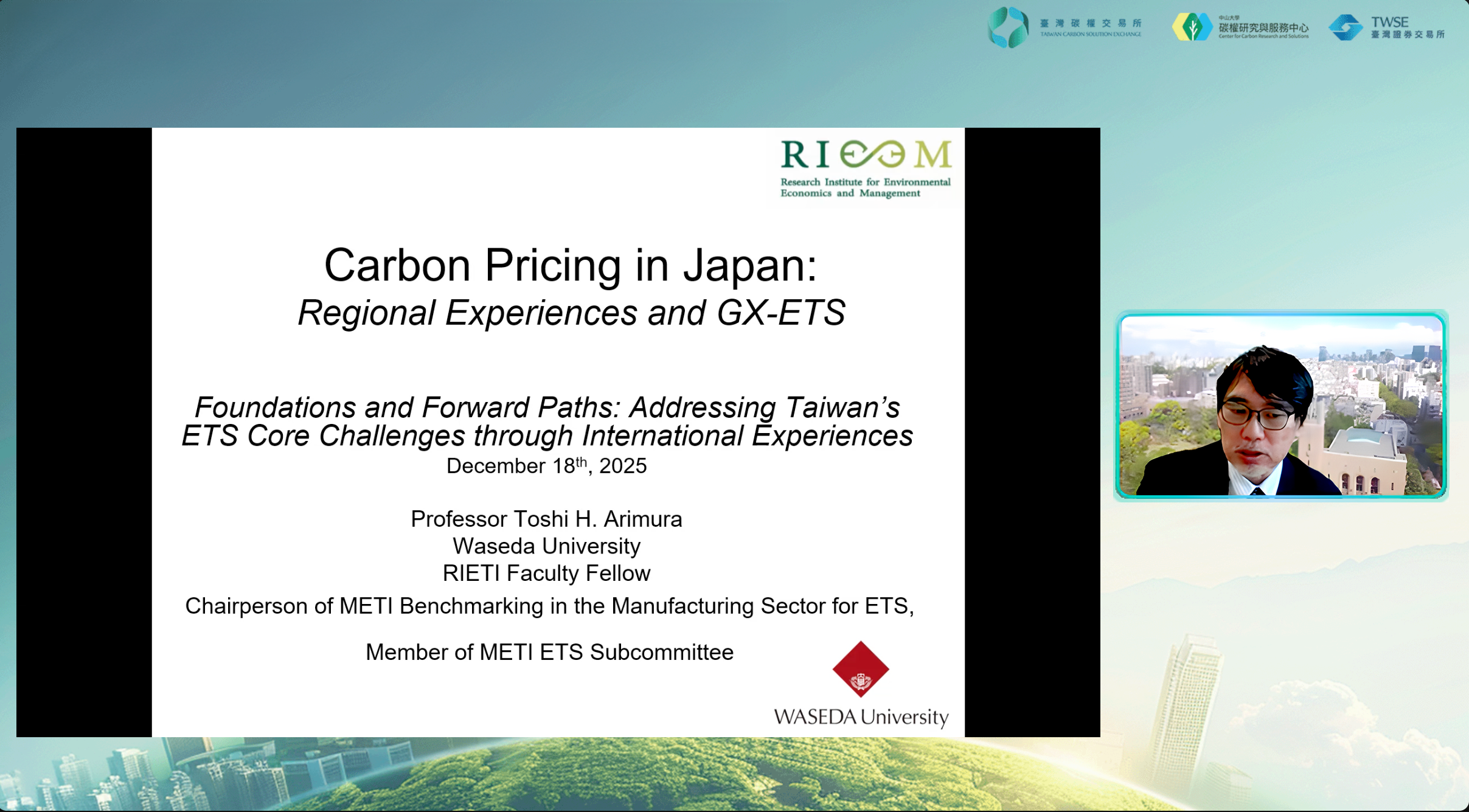 日本早稻田大學環境經濟與經營研究所所長有村俊秀擔任經濟部製造業標竿值工作小組委員會主席,分享日本GX-ETS的發展經驗。他指出,第一期制度開放企業自願參與、而成員可獲得政府氣候轉型債券資助研發創新,有效建立企業參與基礎、降低制度阻力。而明年起,GX-ETS將正式全面強制實施,為回應國內產業對於價格穩定的需求,經濟部納入國內外碳價格趨勢考量,將進一步制定市場價格上下限,除避免造成額外負擔、也有效促進低碳投資與行為改變。