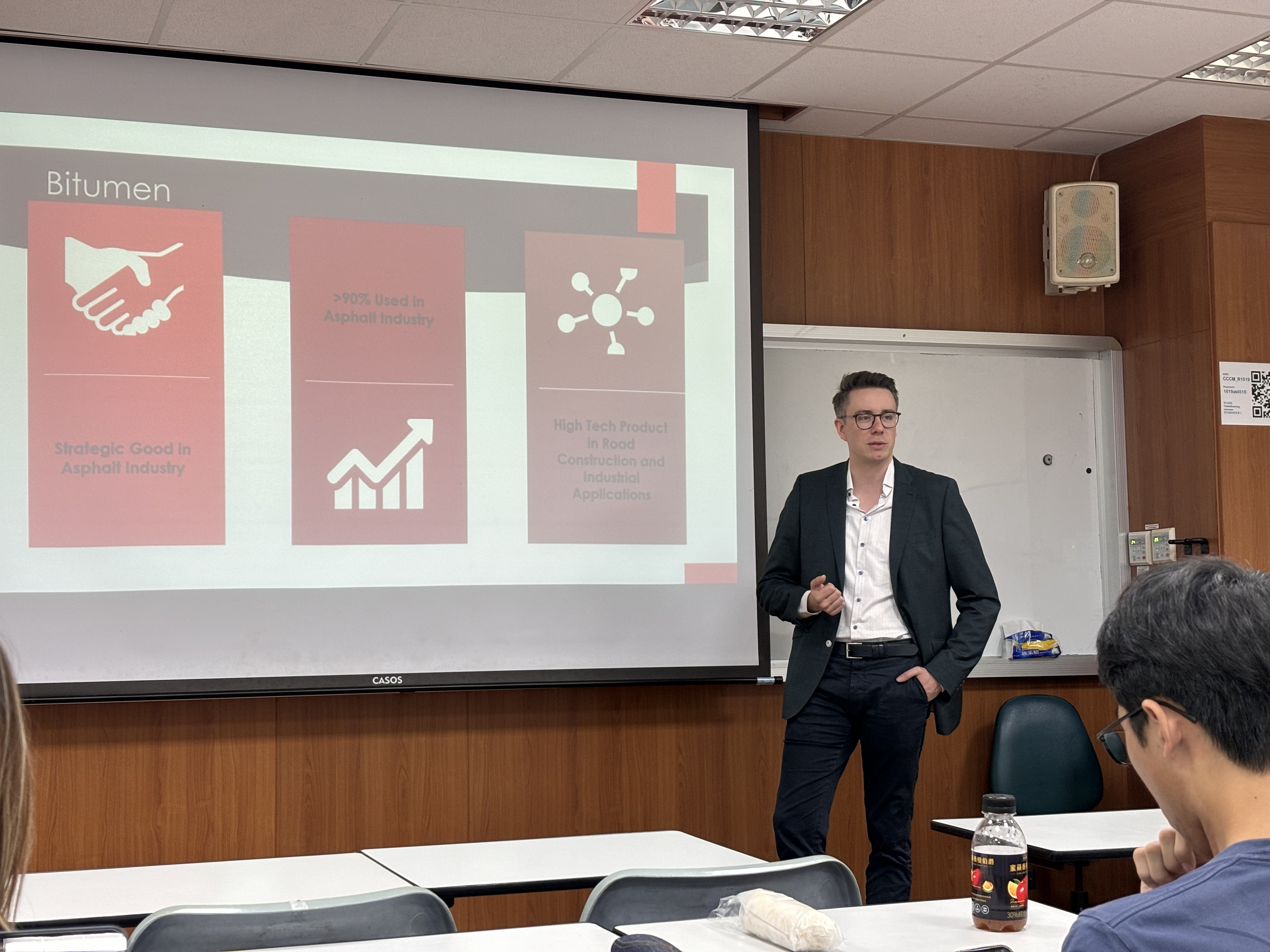 在講座中,J.P. 以淺顯方式介紹瀝青產業——一項在現代道路建設中極具關鍵性的高價值材料。瀝青雖僅占柏油混合物約 5%,但策略重要性極高,並且佔據很大一部份的瀝青成本。他也分享殼牌的日常營運,包括每日財務檢核、與貨運公司的密切合作,以及依專案量體進行的客戶管理。