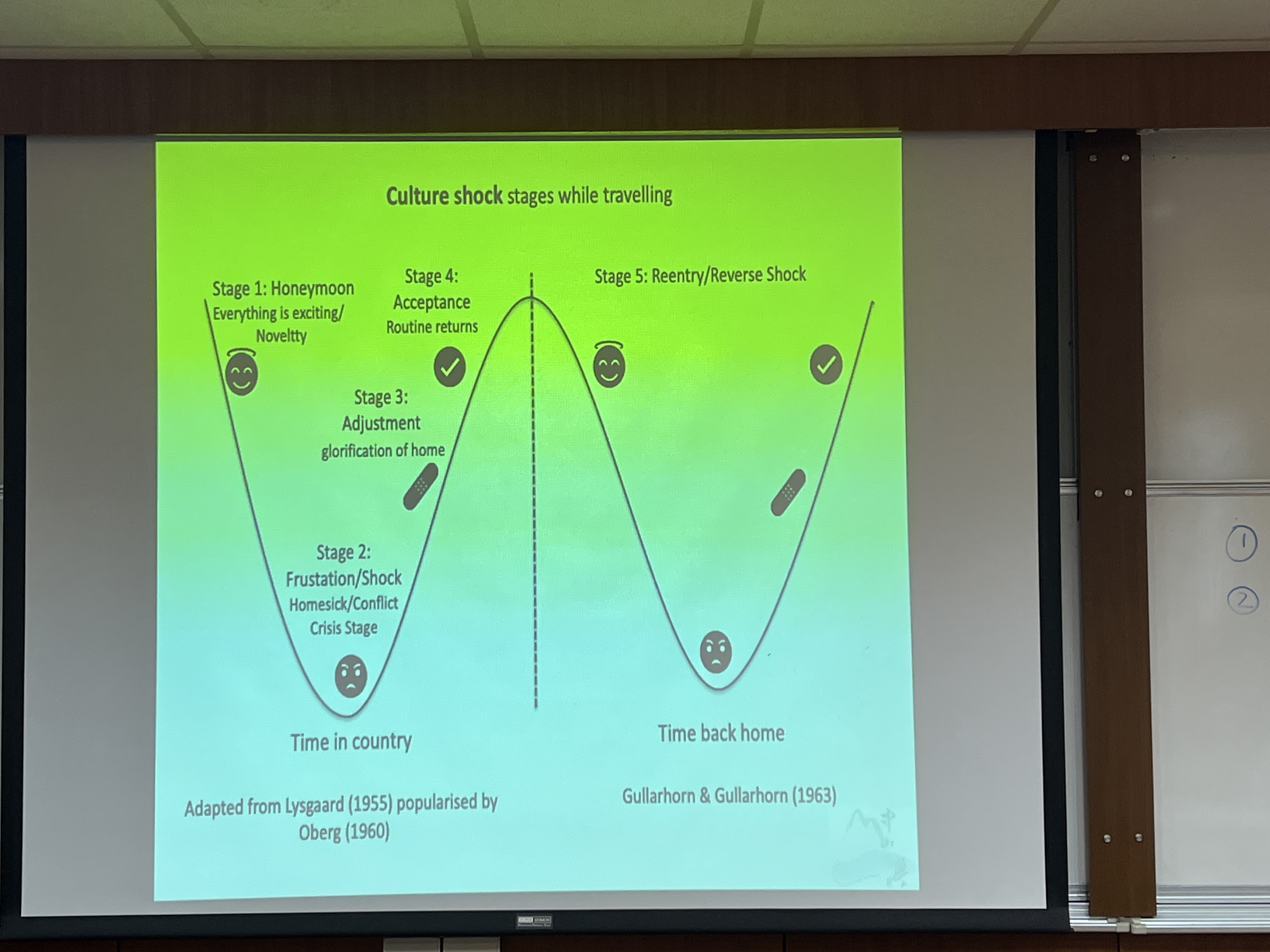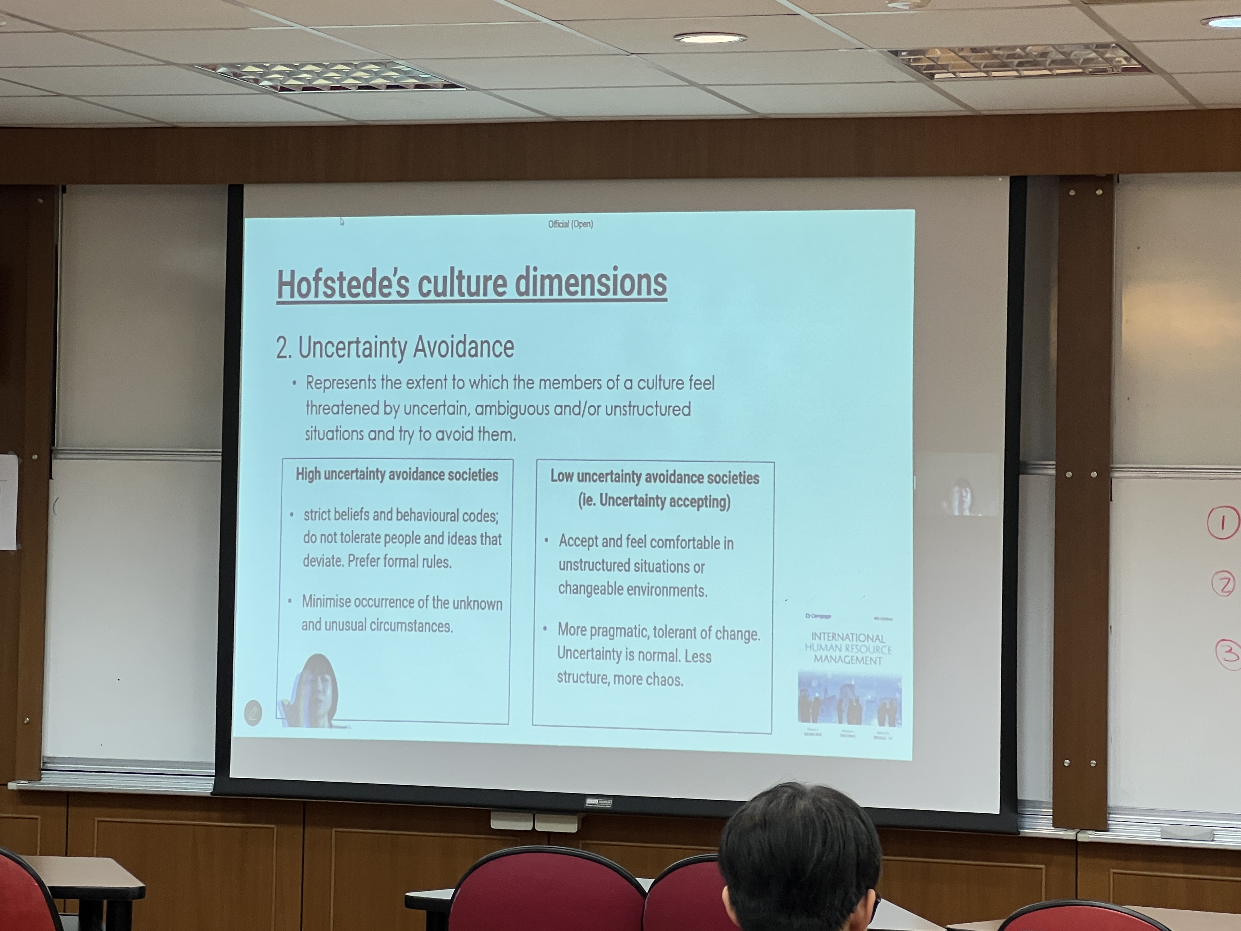 課程首先由雷英瑞介紹文化衝擊(Culture Shock)的U曲線與W曲線模型,說明個人在跨國移動時可能面臨的情緒起伏,包括蜜月期、挫折期、調適期與再適應期等階段。接著,Kailynne Lee則以Hofstede文化六向度為主題,帶領學生比較臺灣與新加坡在權力距離、不確定性迴避、長期導向等面向的差異,並說明這些文化特質如何影響職場溝通與組織行為。