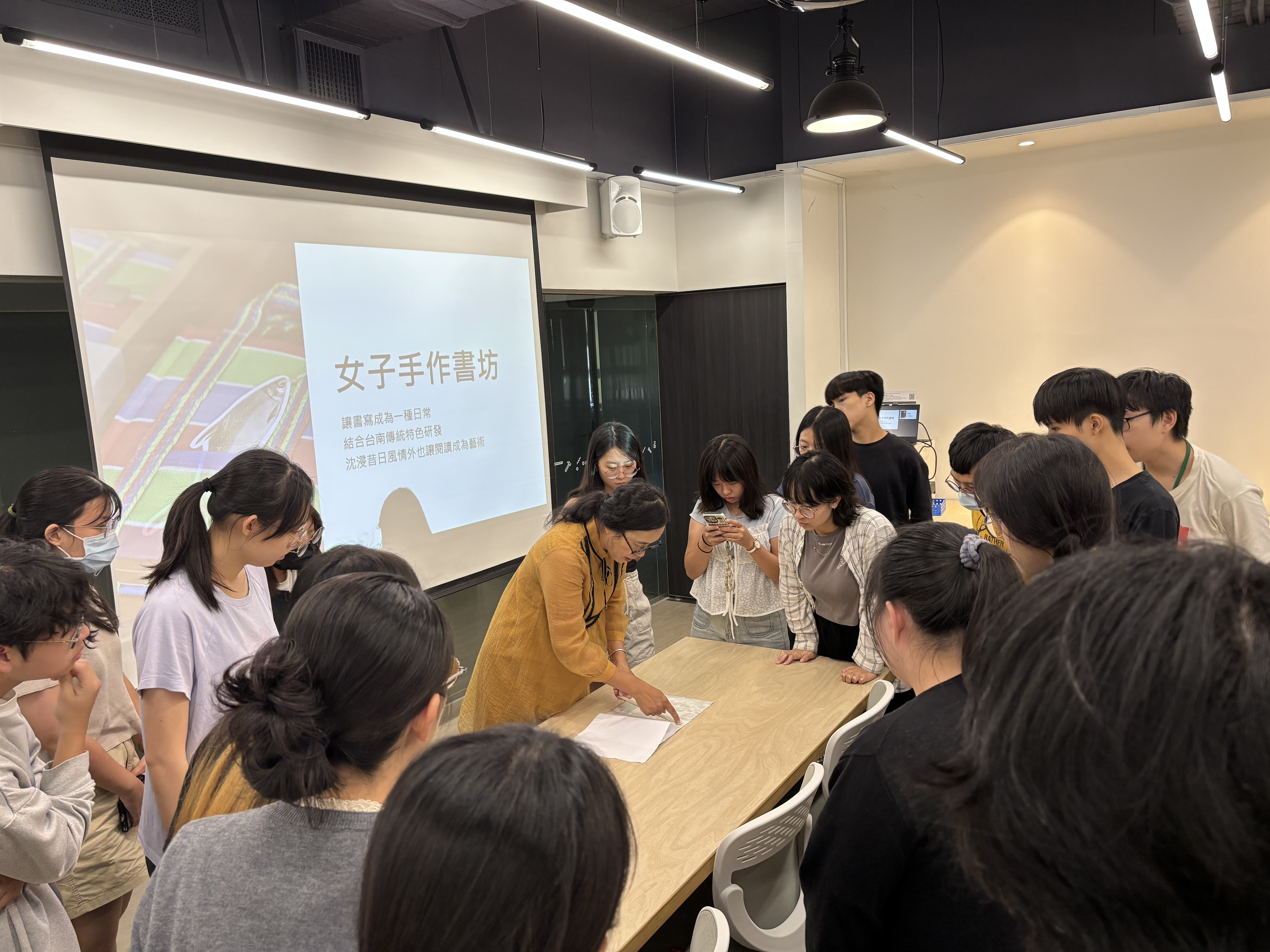 工作坊講師、女子手作書坊主理人杜瓊宜長期投入手工書教學與文創設計,曾以「茄仔袋手工書」獲得2019年文創獎項肯定,並以此契機開始在創意市集創業。她於課堂分享如何以手作書在市集中脫穎而出,以及從文化符碼、材質選擇到市集經營的創作歷程,讓學生更理解手工書背後的故事與價值。