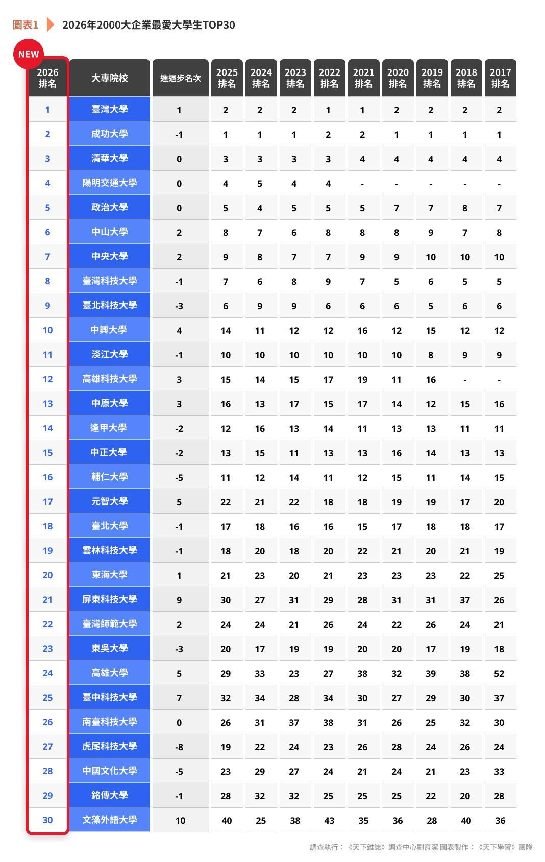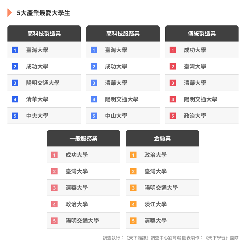 「2026年企業最愛大學生調查」TOP10榜單依序為臺灣大學、成功大學、清華大學、陽明交通大學、政治大學、中山大學、中央大學、臺灣科技大學、臺北科技大學與中興大學。