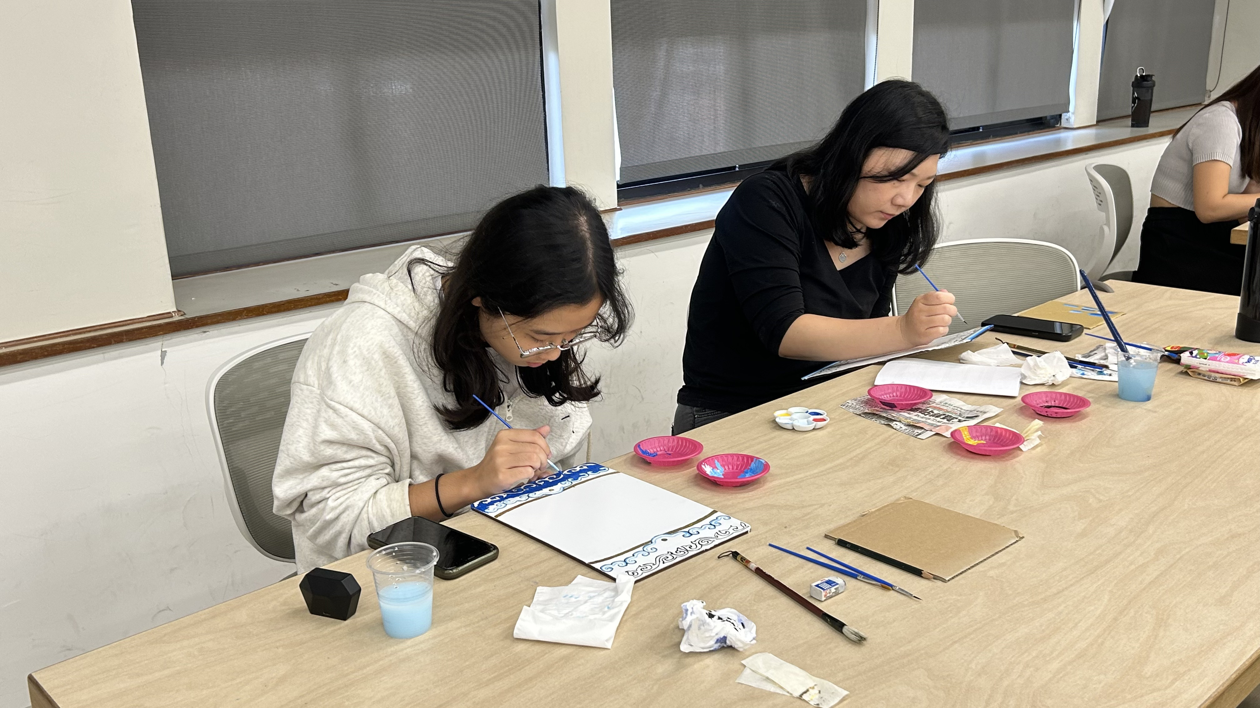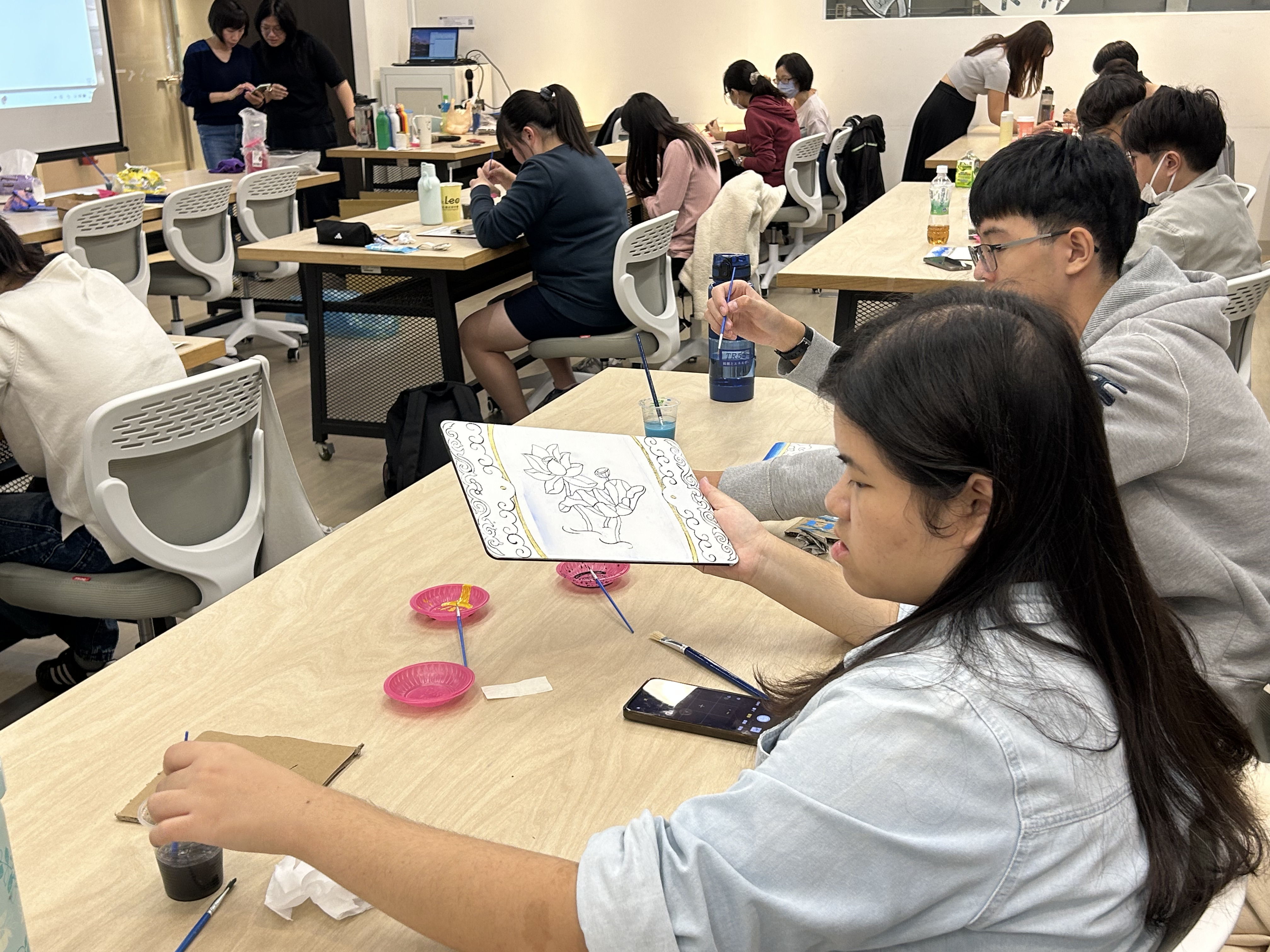 課程下半段則由蒔蒔刻刻工作室負責人黃靜怡帶領學生進行彩繪實作。她首先介紹傳統廟宇彩繪所需的材料、工具與傳統技法,隨後就進入了本次課程最精采的實作環節。學生們在老師的專業指導下運用退暈、貼金等傳統工法完成堵頭,並在垛仁的部份一筆一畫繪製出荷花、梅花等常見於臺灣廟宇的彩繪圖樣。透過親手進行創作,學生深刻感受到傳統工藝所需的耐心、技術與美感。