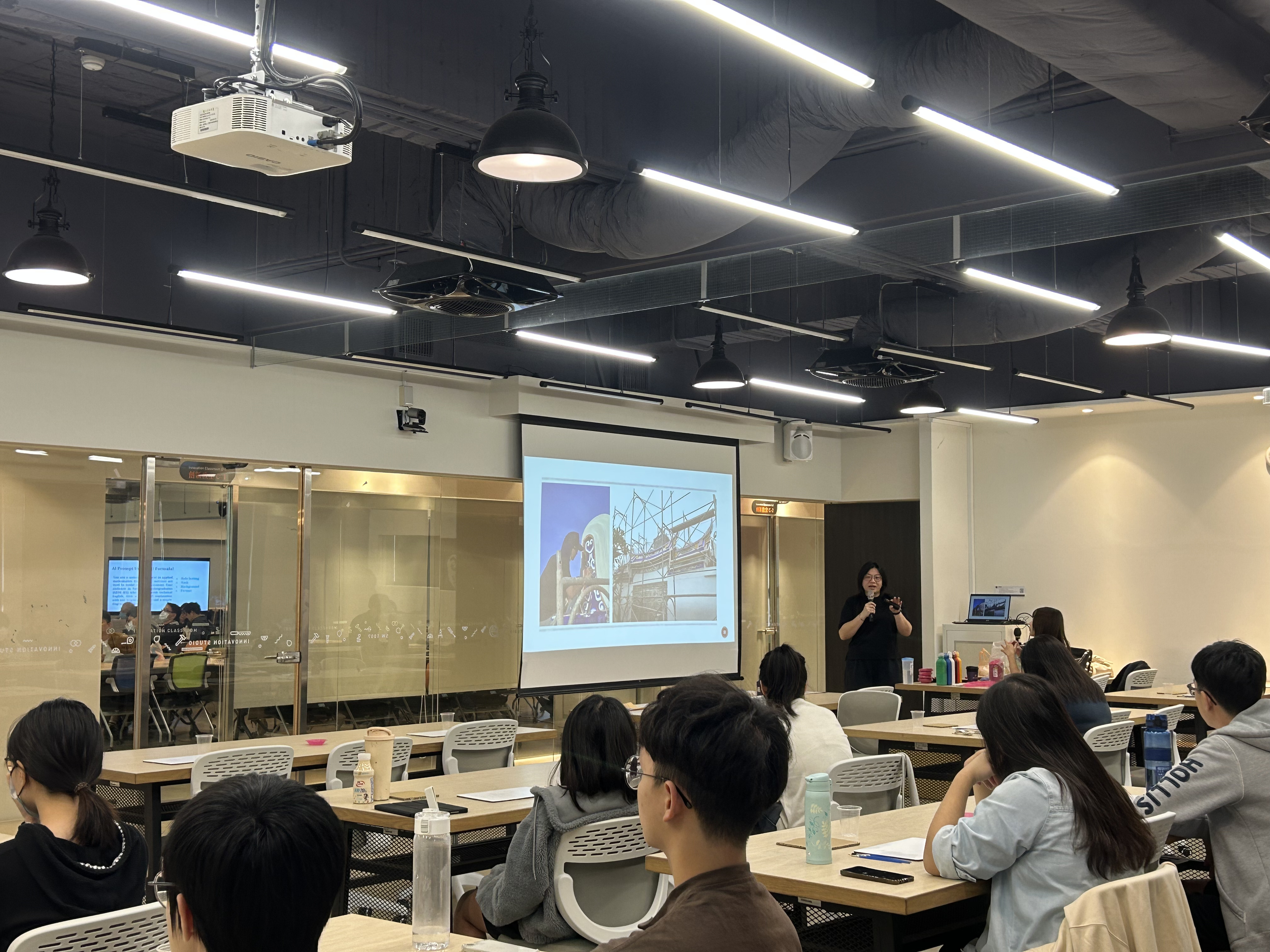 課程上半段由國立臺灣藝術大學古蹟藝術修護學系助理教授范雅婷講授古蹟藝術修護的核心概念,並介紹臺灣建築史與《文化資產保存法》的發展脈絡,讓學生理解古蹟保存並非單純技術操作,而是與歷史、文化、生活息息相關的重要工作。范雅婷向師生介紹了傳統建築彩繪最初源於木構建築,需要以油漆保護結構,隨著時間演變逐漸成為融合信仰、審美與工藝技術的獨特文化象徵,此外她也講解了「彩繪」中的「彩」與「繪」之間的差異,並介紹臺灣傳統廟宇建築及其彩繪要素,使學生更能理解工藝背後的文化內涵。