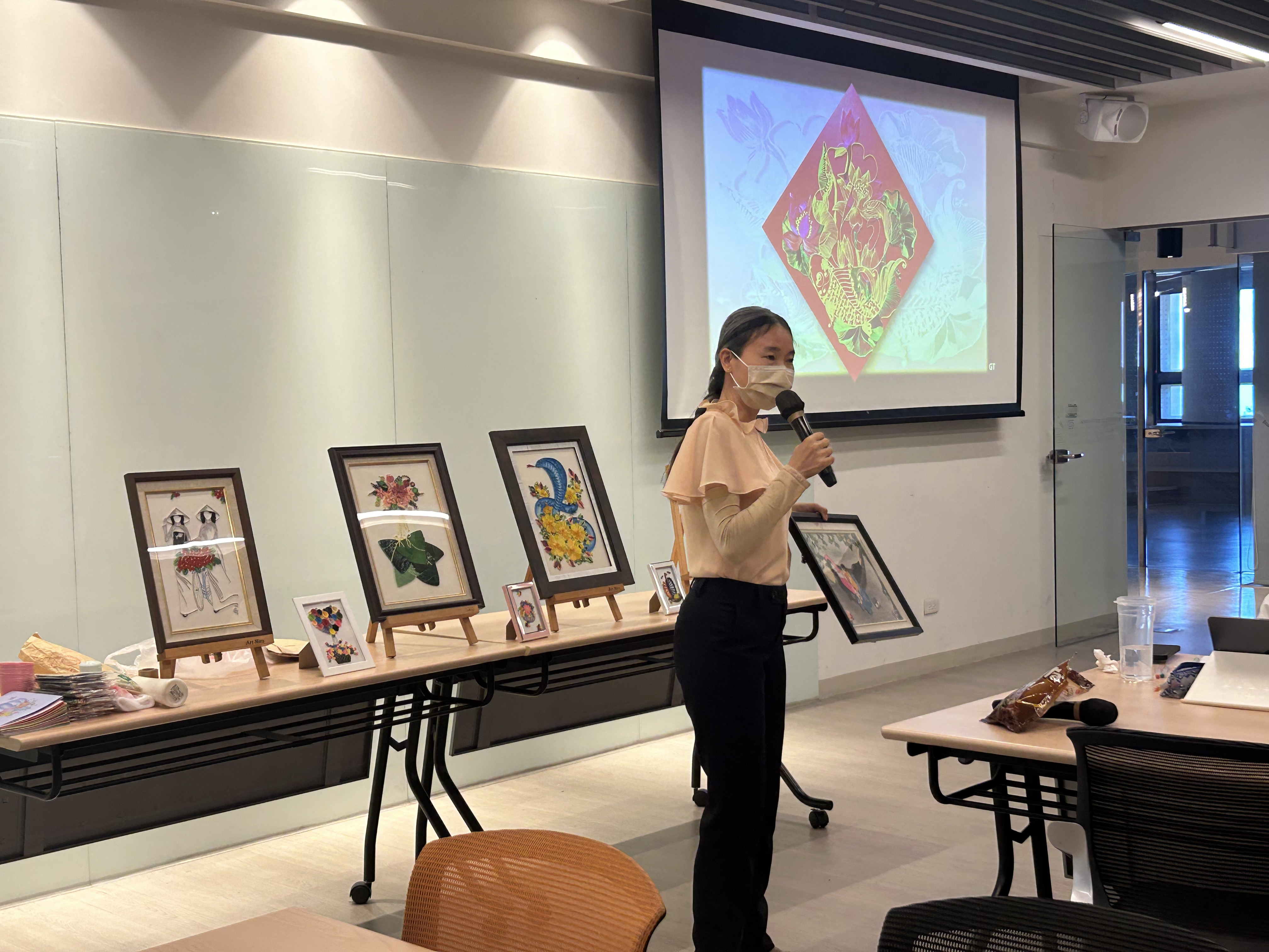 越南曾為法國殖民地,捲紙藝術也傳入越南,演變為當地文化藝術,不僅傳承手工技藝,更體現越南人對日常生活美學的重視,作品主要描繪越南當地生活景觀與花卉,除了作畫外,也可做成卡片、書籤等,應用層面廣泛。越南捲紙工藝者阮氏雪長期推廣藝術創作,本次工作坊帶領學生製作越南傳統感恩卡,運用色彩繽紛的紙條,親手捲出具有越南風格的立體花朵,完成獨一無二的卡片。