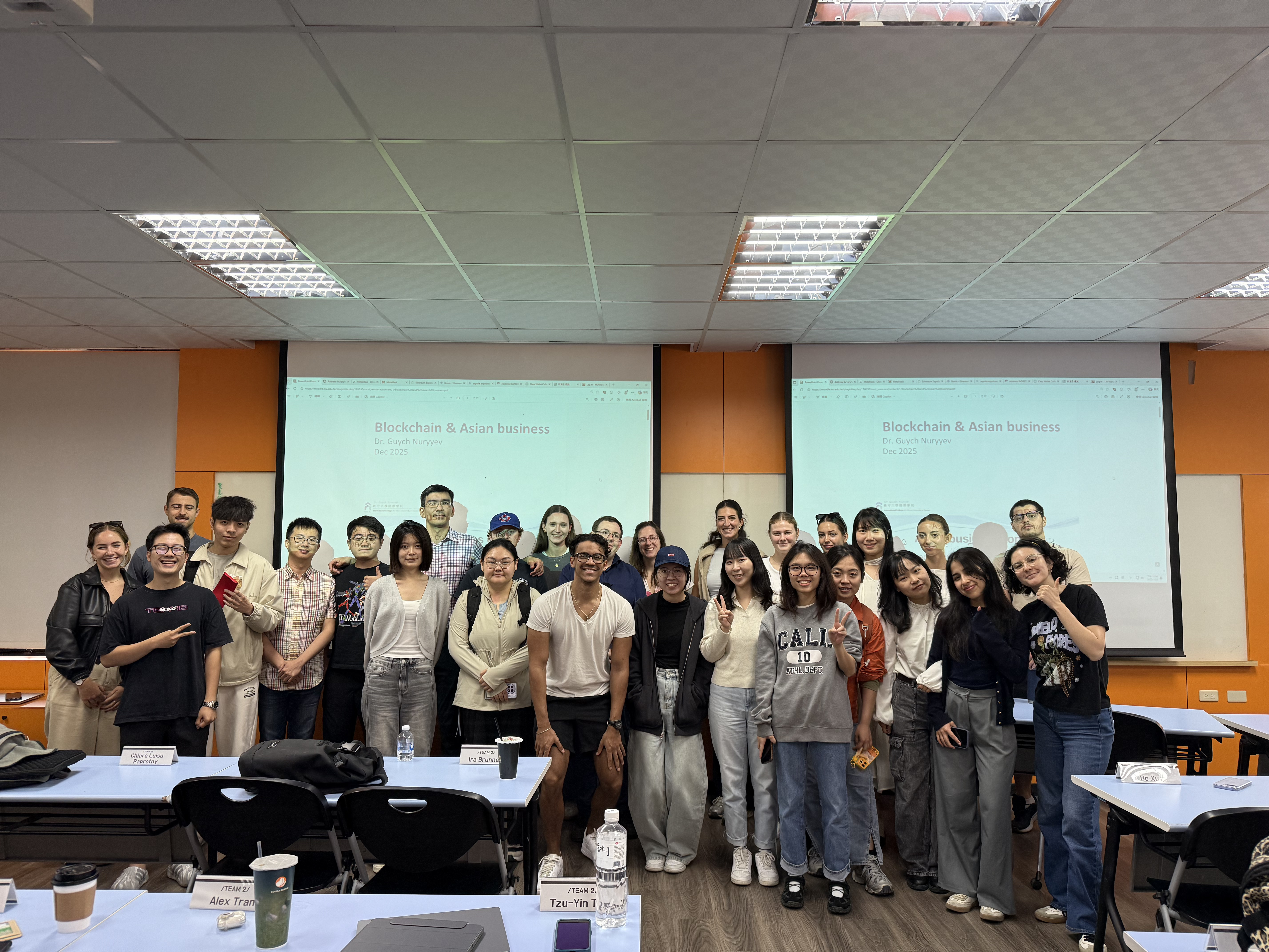 說明文化差異後,Guych Nuryyev進一步介紹區塊鏈技術,並將其視為一種全新的「資訊公開」方式。他提到,區塊鏈透過不可竄改的帳本,將所有交易永久記錄在系統中,使交易紀錄不需要依賴銀行或政府等中央機構,也能被共同驗證與追蹤。「區塊鏈並非完全匿名,而是『假名化』」,他同時提醒學生常見的誤解,雖然所有交易都對外公開,但背後的真實身分未必一眼就能辨識。這樣的特性,也讓資訊公開、個人隱私、信任建立與群體行為之間的關係,成為數位商業環境中必須重新思考的重要議題。