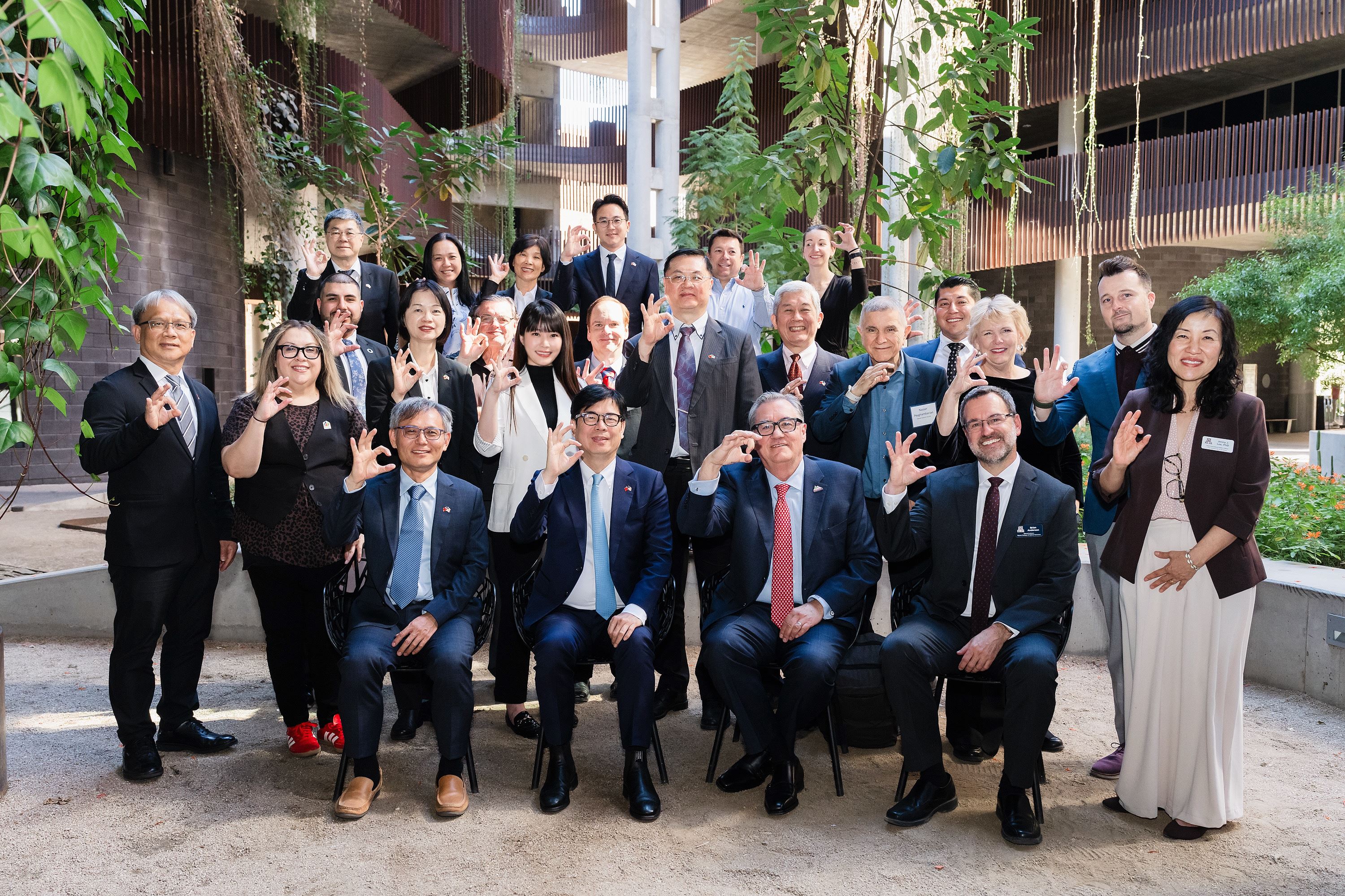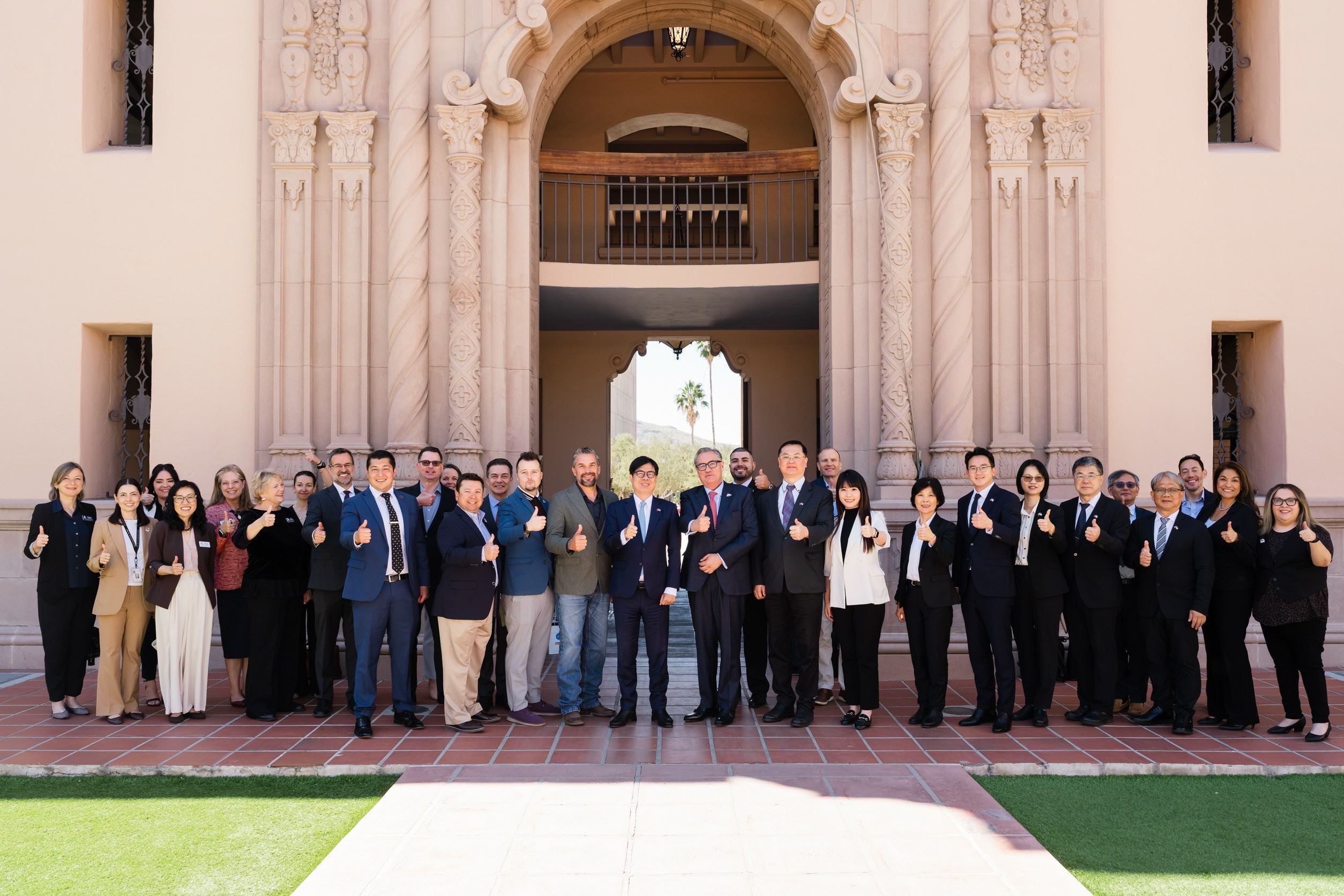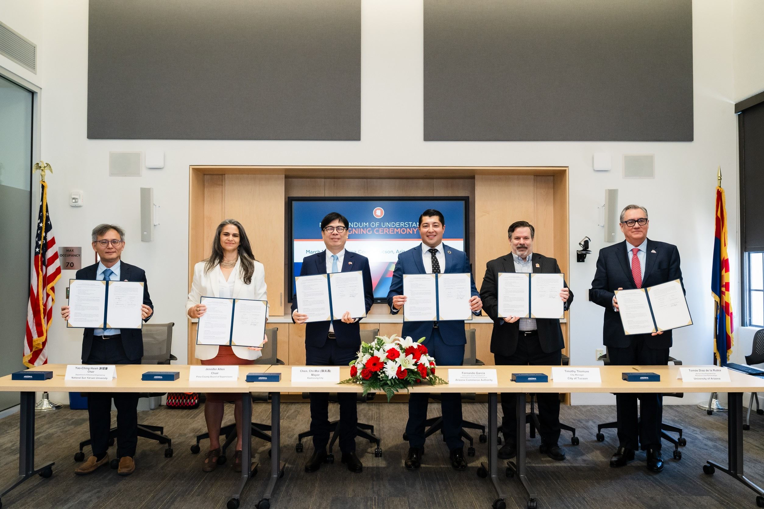 中山大學是此行唯一受邀的大學,隨同高雄市府團隊前往美國亞利桑那州第二大城、被稱為「光學之谷」的土桑市(Tucson),並與亞利桑那州商務廳、皮馬郡府、土桑市政府及亞利桑那大學,在當地指標性歷史建築皮馬郡歷史法院,共同簽署「六方半導體生態系與全球人才夥伴合作備忘錄」。這項合作象徵台美產官學攜手打造跨國半導體合作網絡的重要里程碑。