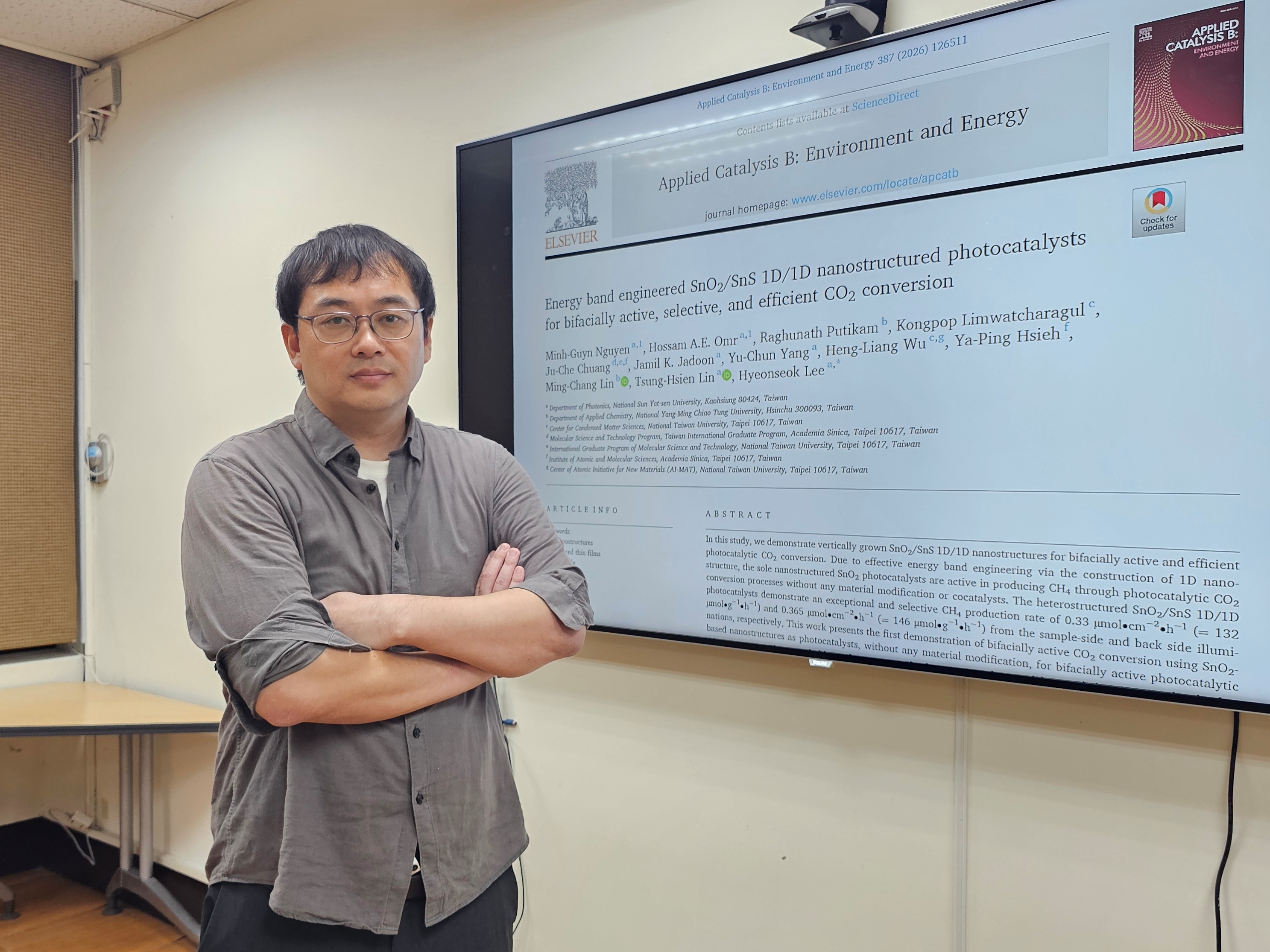 如果人類能像植物一樣,利用陽光把二氧化碳轉換成能源,全球暖化將迎來新的解方。國立中山大學光電工程學系副教授李炫錫研究團隊,成功模擬植物光合作用原理,研發出新型奈米光觸媒材料,能利用太陽光將二氧化碳轉換為甲烷(CH4)等燃料,達到減少溫室氣體與產生新能源的雙重功效。創新研究成果獲登國際頂尖期刊「應用催化B:環境與能源」(Applied Catalysis B: Environment and Energy)。