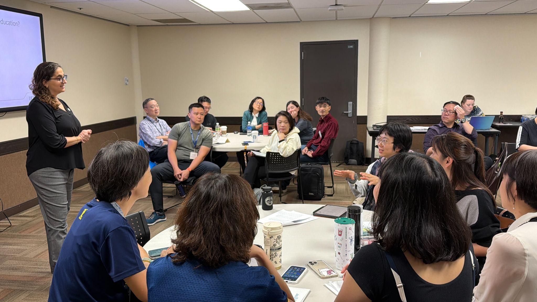 海外師訓研習課程內容涵蓋主動式學習(active learning)、形成性評量(formative assessment)、融合教育(inclusive teaching)、生成式人工智慧(GenAI)於教學中的應用,以及跨文化溝通與課堂互動設計等核心議題。參與教師透過工作坊、觀摩美國大學課堂、進行教學演示,深入感受並理解以學生為中心的教學理念,並學習如何在EMI環境中提升學生的參與度與學習成效 。