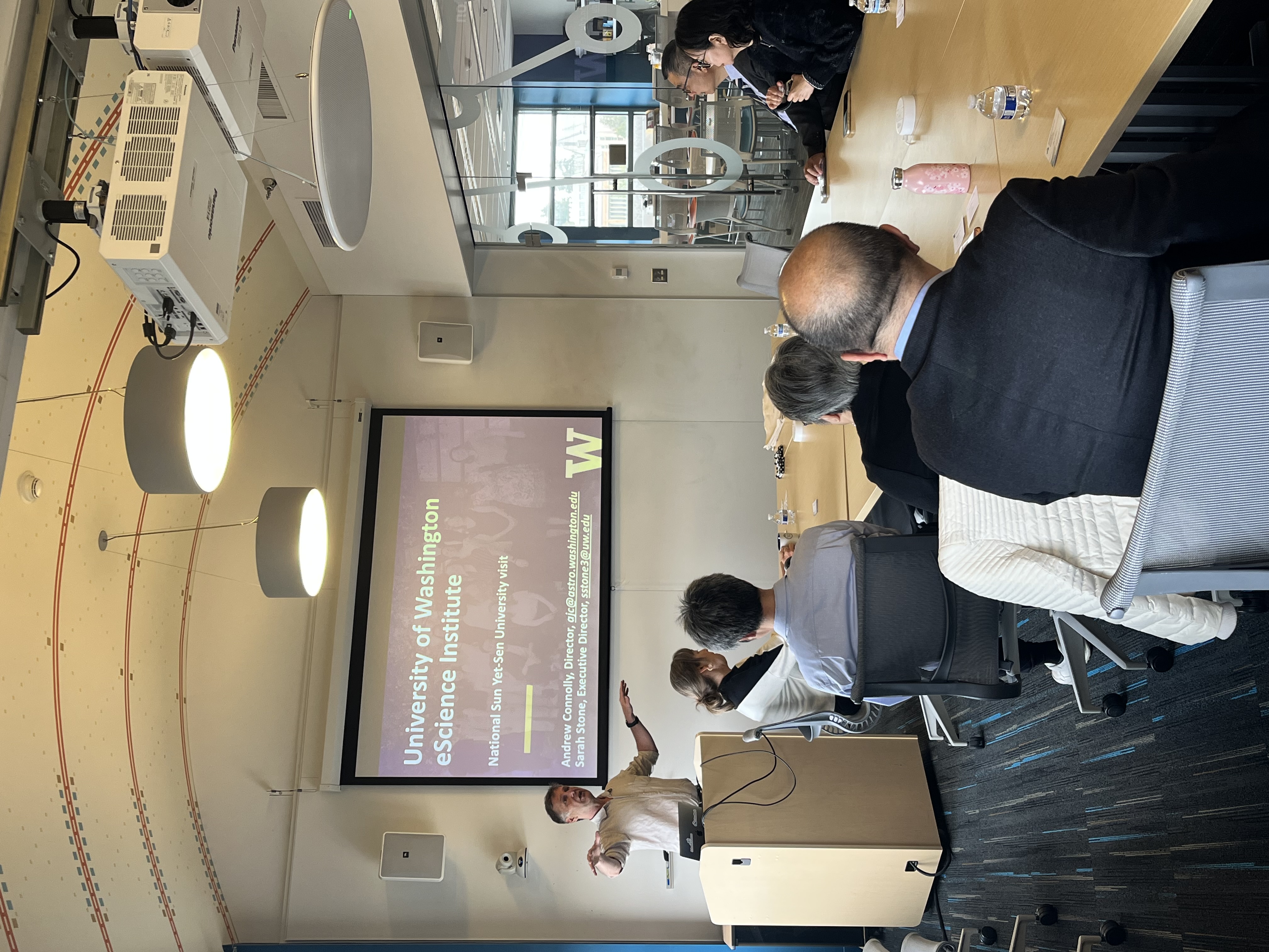 訪問團也前往華盛頓大學推動數據科學的重要單位eScience研究中心。該中心支援校內超過1萬5千名師生進行AI與數據科學相關研究與教學,並與企業及研究機構合作。中山大學團隊在會中介紹校內AI教學與研究成果,並與該中心研究人員討論資料分析方法、教學資源共享與未來合作可能。